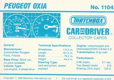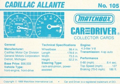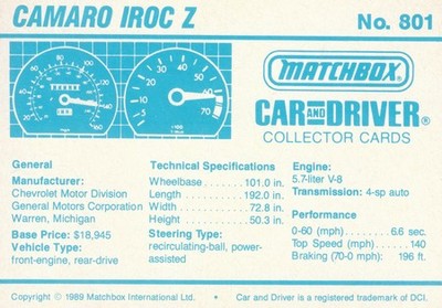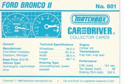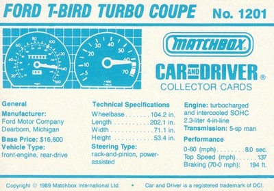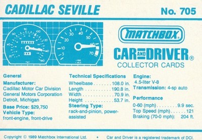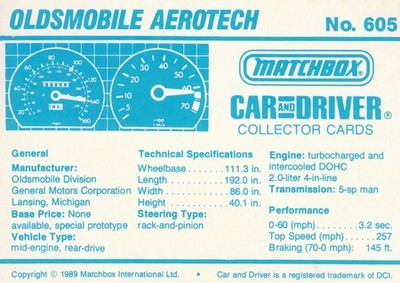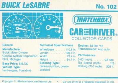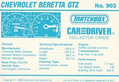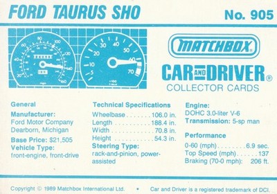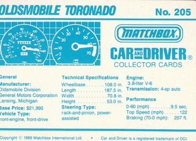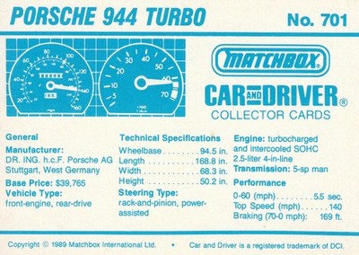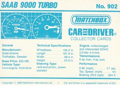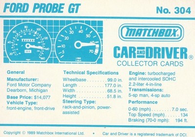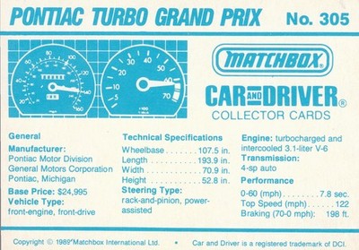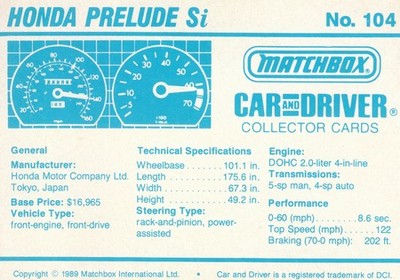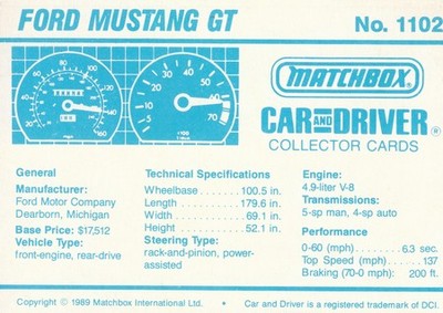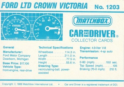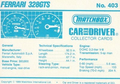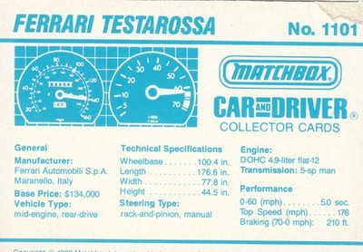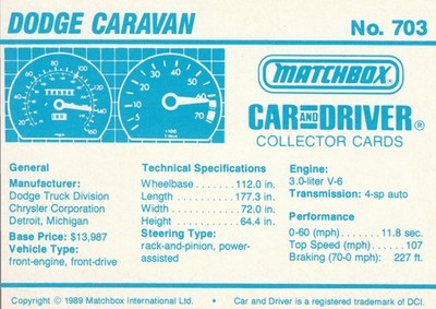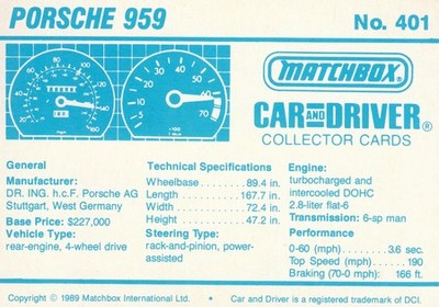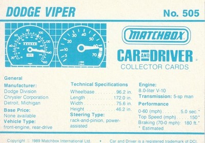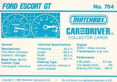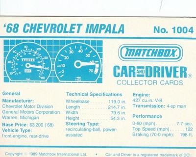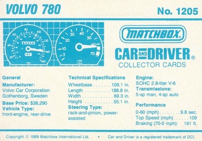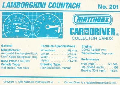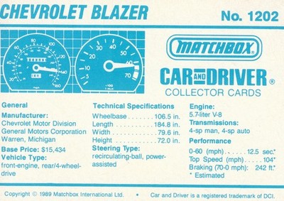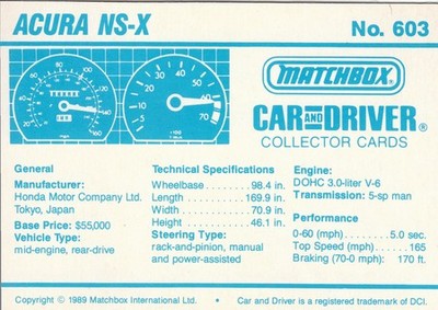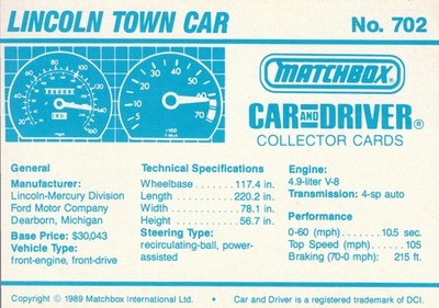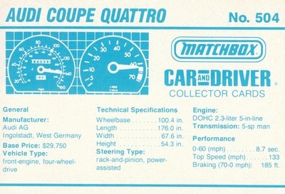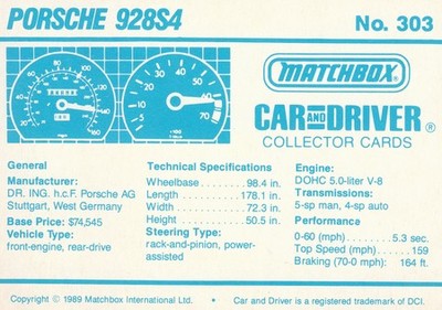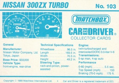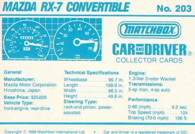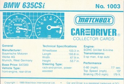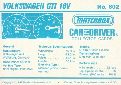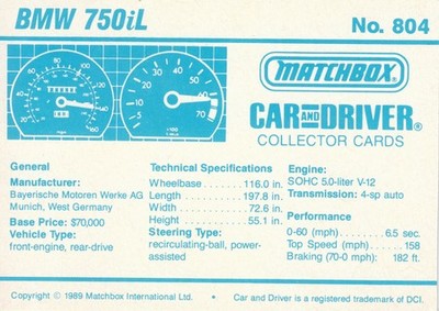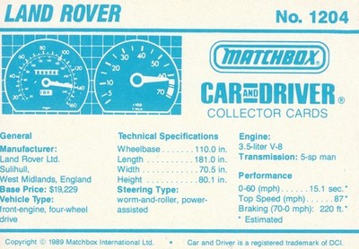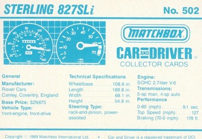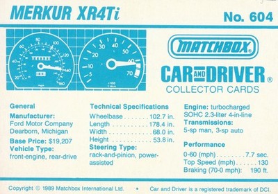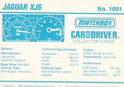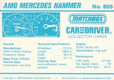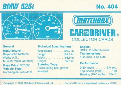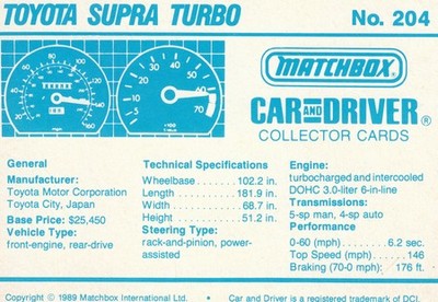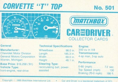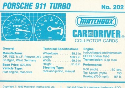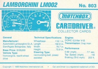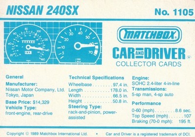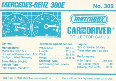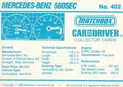 These cards were issued in 1989. There were 12 sets of 5 cards. Each set came packaged with a Matchbox model car. However, the cars were regular issue models, and not exclusive, so that probably limited the sales of the cards. I own a full set of the cards, plus three of the vinyl wallets that held them. There are several doubles in my Matchbox collection due to me buying the same car I already had, to get the cards. You'll see a lot of vehicles that were actually in the Matchbox Lineup, and some that never were, including some that would have made pretty cool Matchbox cars. I just discovered that there was a completely different set of cards produced for Hong Kong. Click here to see: Collector Cards- Matchbox, Car & Driver HK Version